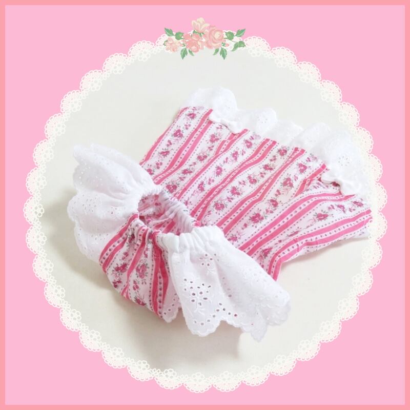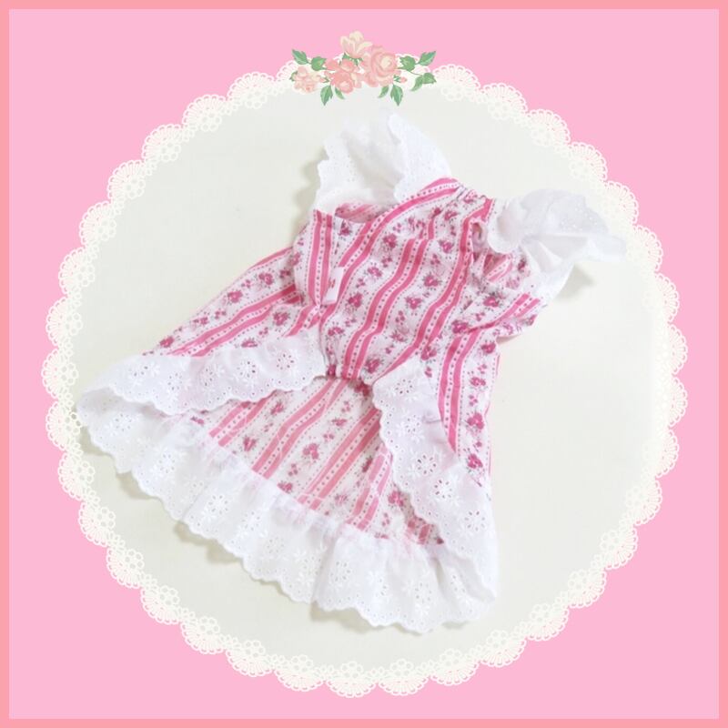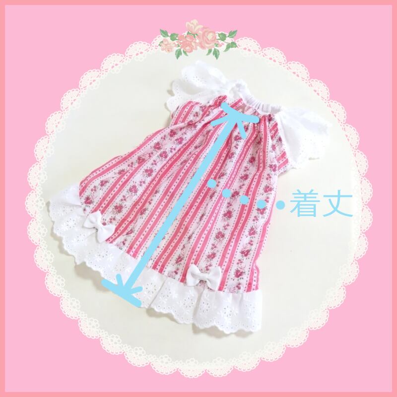 ★華やかなバラのブーケとピンク色のストライプ柄の上に、白い糸でお花の刺繍が施してある、とても繊細な生地を使用しています。肩回りとスカート裾にはコットンレースをあしらい、清楚な白いリボンを二つ添えました。