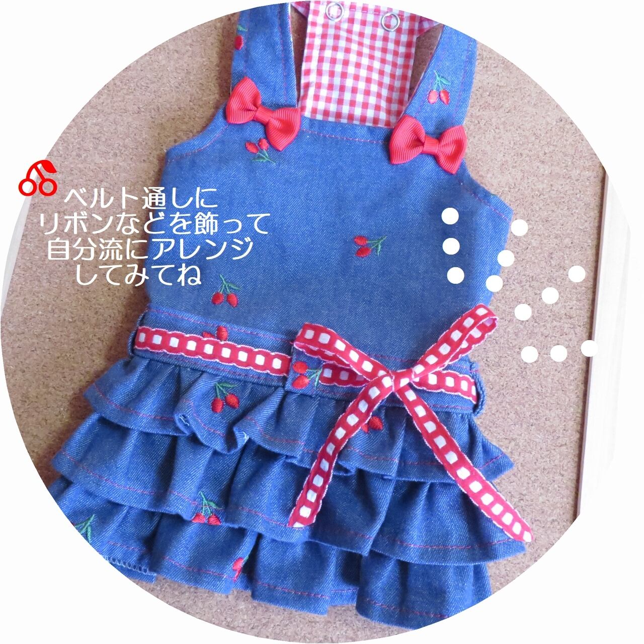 ★デニムカラーに赤いさくらんぼ刺繍が可愛いカジュアル&ガーリーテイストな布地で、三段フリルのサロペットスカートをお作りします。