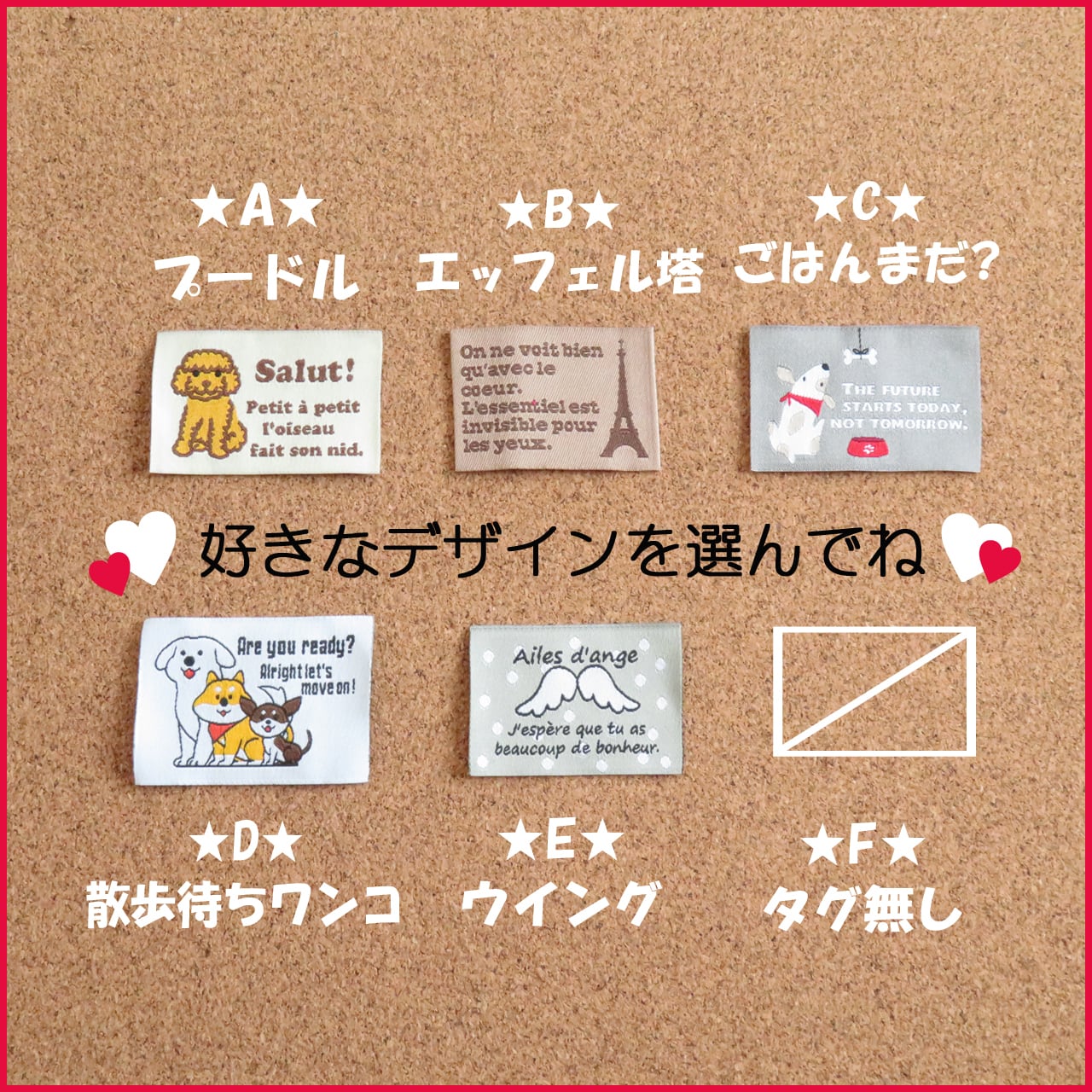 ★背中側のアクセントに、デザインタグをサービスでお付けします。絵柄は全部で5種類ありますので、お好きなデザインを選んで下さいね♪